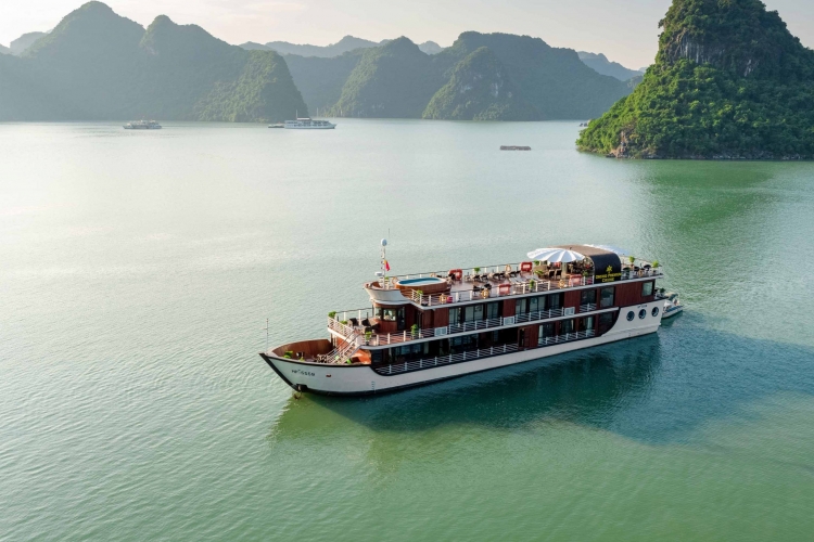 13:00 Quý khách thưởng thức bữa trưa, ngắm cảnh trong khi du thuyền bắt đầu hải trình khám phá Vịnh Hạ Long, một trong bảy kỳ quan thiên nhiên thế giới.