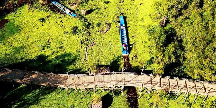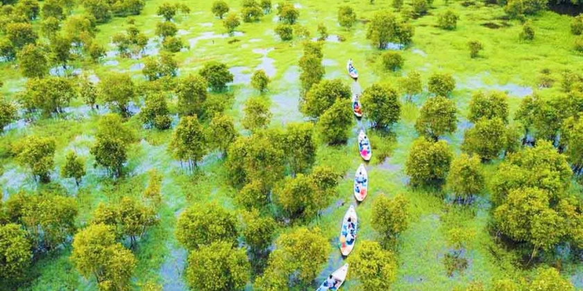 Quý khách bắt đầu tham quan hệ sinh thái rừng tràm ngập nước tuyệt đẹp vào buổi sáng theo lộ trình. Quý khách tản bộ 500m từ bãi xe vào đến bến đò sau đó đi tắc ráng (xuồng máy) khoảng 10 phút chạy dọc bờ kênh trong rừng tràm rợp mát với khung cảnh tựa như tranh đến trạm dừng đầu tiên.